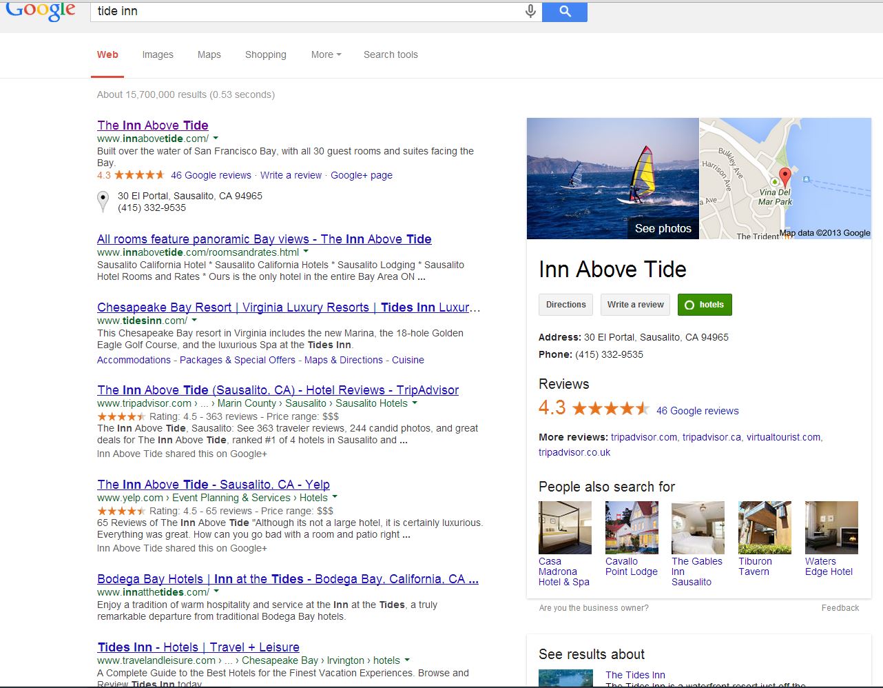 With the 2nd pic, it’s even more sobering. I searched for Tide Inn, and the “Inn Above Tide” is what pops up. The hotel populates 50% of the page… and at the very bottom, tiny, it reads: “see results about the Tides Inn”. I know the search term isn’t precise, but to think that our hotel could crowd that much organic search real estate is astonishing. I also know these are personalized and non global searches, reaffirming my own confirmation bias and selective perception, as we all learned about in Eli Pariser’s BRILLIANT “Filter Bubble: What the PErsonalized web is not telling you.” Watch a TED Talk here. Still… with this awareness of how the internet delivers tailored results, the obviousness of the succinct and somewhat elegant metaphor of your plus page as an ad should not ring hollow. These photos should help you get on the bandwagon, and stop focusing on silly posts that don’t do anything for your hotel.