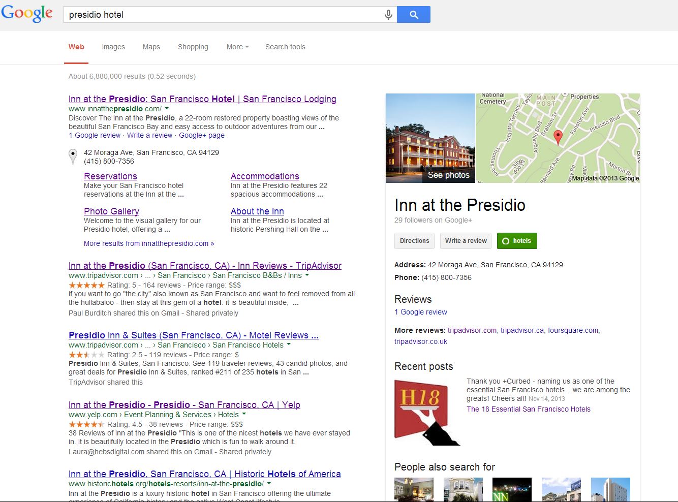 But, with that image, it obviously means that all attention is on the right. What’s more, if you are NOT active online and claiming this G+ listing, you become irrelevent. I think this is the scariest message I want to relate. This is wholly by accident, but there’s another hotel with “Presidio” and “Inn” in the title, and they barely appear anywhere, anymore. We’ve taken ownership of their brand name with our activity, and add that to their absence of presence, wholly by accident…. we’re probably digging into them a bit.