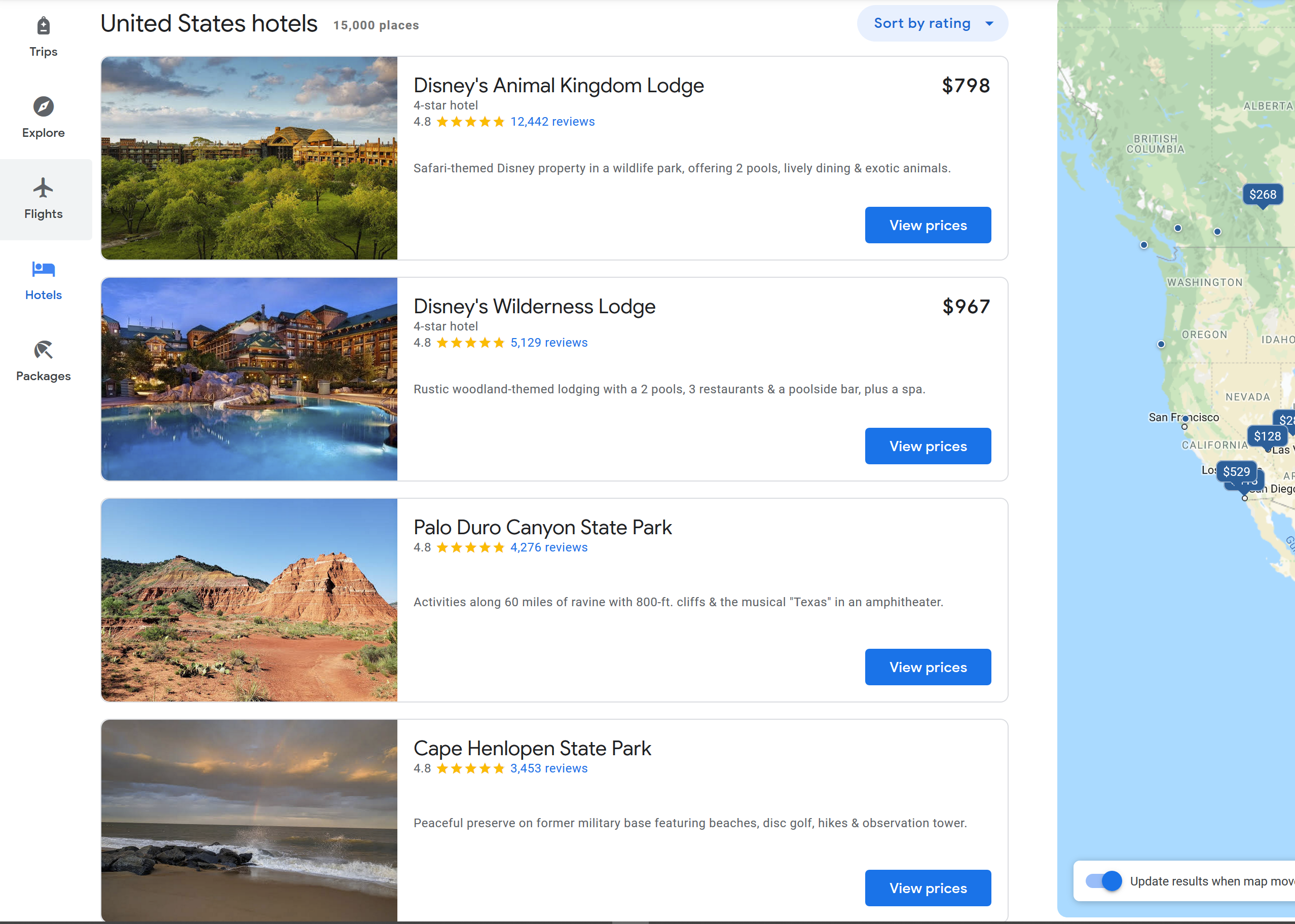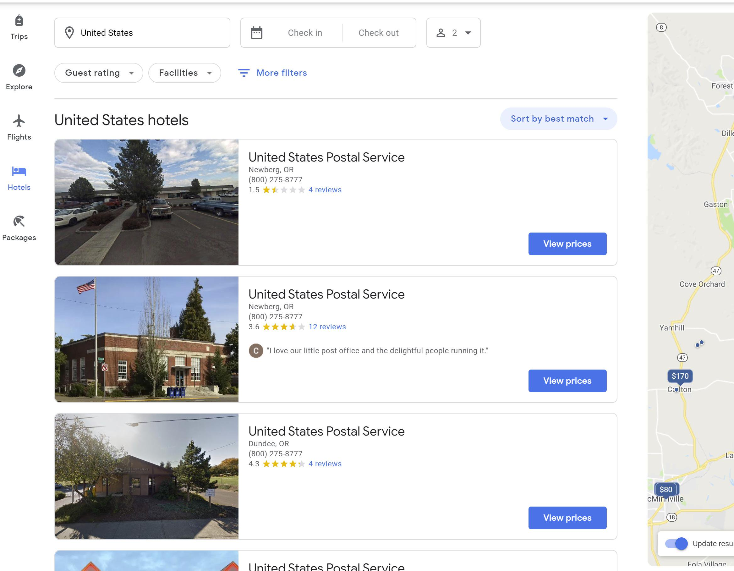 I don’t know how I returned post offices, but I just tried to recreate it, and searching “highest rated hotels” in the US returns state parks: